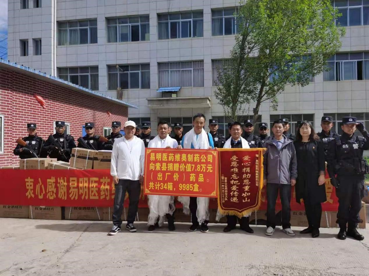 值此中国共产党建党100周年暨西藏和平解放70周年之际,通过那曲索县公安局组织协调,易明医药下属全资子公司四川维奥制药有限公司向西藏那曲索县卫生健康委员会捐赠了一批价值近8万元的常用药品,希望能在一定程度上缓解当地群众的日常用药问题。